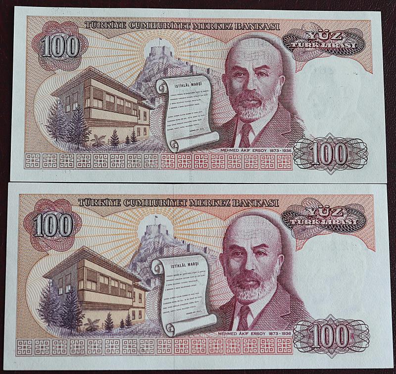 Türkiye Cumhuriyeti 7. Emisyon 2. Tertip 100 Lira E11 266241/ E82 671064 Farklı Filigran Takım Çil başlıklı ürün, Efemera, Müzik, Sinema > Nümismatik, Para, Madalya > Kağıt Paralar > Cumhuriyet Dönemi > 6. Emisyon kategorisi altında İkinci El olarak satılmaktadır.