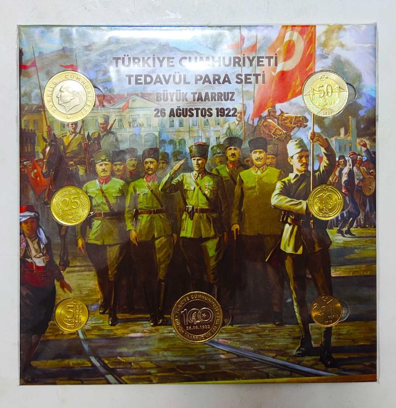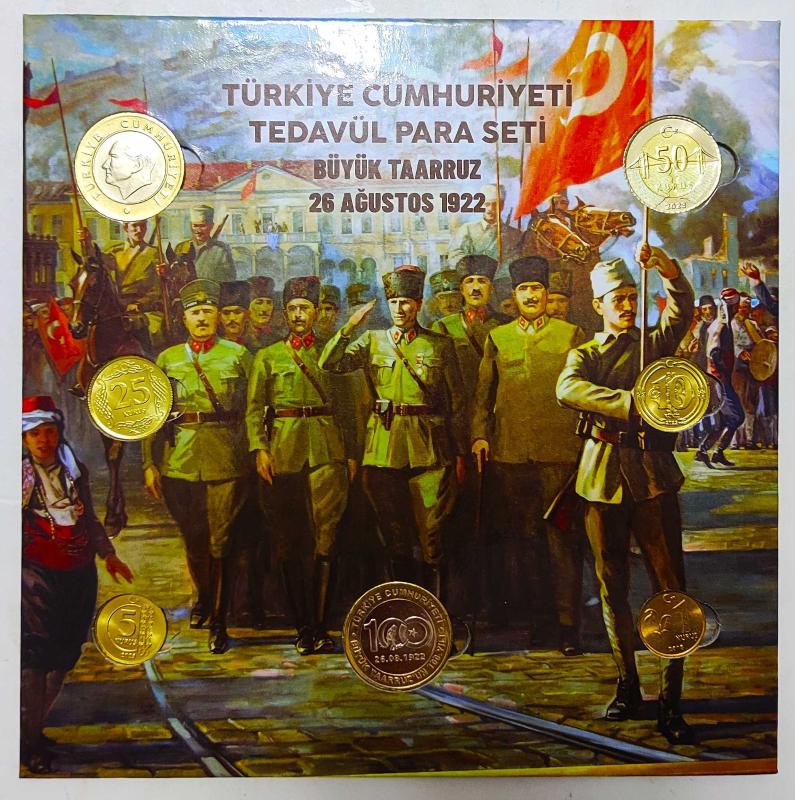 Türkiye Cumhuriyeti Tedavül Para Seti.. ((Büyük Taarruz)) Jelatininde.. İçindekiler Taarruz Hatıra Tedavül 1 ₺ Ata 1 lira : -- 50 Kuruş: 2023 25 Kuruş: 2023 10 Kuruş: 2023 5 Kuruş : 2023 1 Kuruş. : 2018