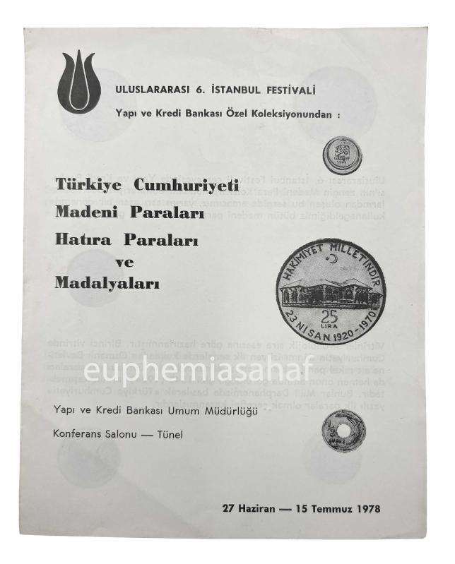 Özgün kağıt kapağında, pamphlet, çok temiz durumda, 23 x 15 cm, [4] sayfa, s/b levhalar. "Türkiye Cumhuriyeti madeni paraları, hatıra paraları ve madalyaları. Yapı ve Kredi Bankası Özel Koleksiyonundan. 27 Haziran - 15 Temmuz 1978. [Sergi broşürü].", YAPI VE KREDİ BANKASI ÖZEL KOLEKSİYONU, Yapı ve Kredi Bankası Umum Müdürlüğü, İst., 1978. Yapı Kredi Bankası, 1960'lı başında Kâzım Taşkent Galerisi?ni kurarak, sanat galerisi olan ilk Türk bankası olmuş ve kuruluşunun 20. yılı anısına burada Türk Folklorünü ve sanatını destekleyecek pek çok sergiye ev sahipliği yapmış, Topkapı Sarayı?na ait pek çok eseri sergileyerek halkla buluşturmuştur. Bu konsept dahilinde 70'li yılların sonlarına dek düzenli olarak sergiler düenleyen banka, bu sergilerin broşürlerini de basarak Cumhuriyet tarihine bir hem birer hatıra, hem de belge niteliğinde bir katkı sağlamıştır. 80'li yılların başındaki siyasî konjönktür gereği sergilere ve kültürel programlara ara verilse de günümüzde de Yapı Kredi'nin bu mi