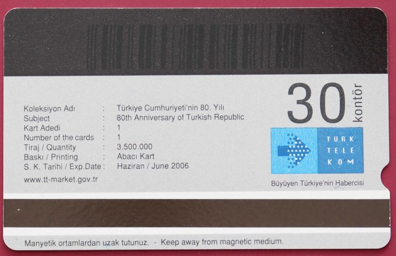 Türkiye Cumhuriyetinin 80'yılı Telefon Kartı * Sitemizde satışa sunulan ürünler aksi belirtilmedikçe 2. eldir. * Ürünler koleksiyon amaçlıdır, tam olarak kullanım amacınıza uygun olmayabilir. * Ürün açıklamaları dikkatle okunmalı ve fotoğrafları incelenmelidir.(Ürün fotoğrafları ürünün hakiki rengini, tonunu göstermeyebilir.) Ürünleri sipariş etmeden önce resimleri incelemeyi unutmayın.. Diğer Ürünlerimiz için Mağazamızı ziyaret edebilirsiniz..