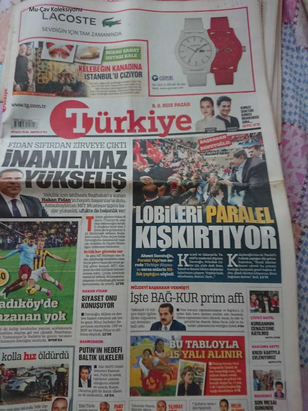 Türkiye Gazetesi,8 Şubat 2015,Lobileri Paralel Kışkırtıyor,Kadıköy'de Kazanan Yok,Fenerbahçe,Trabzonspor,Atletico Madrid,Facebook Gerçekten Faydalıymış,Son Mesai Gününde Kazaya Kurban Gitti adlı eser Türkçe dilindedir.