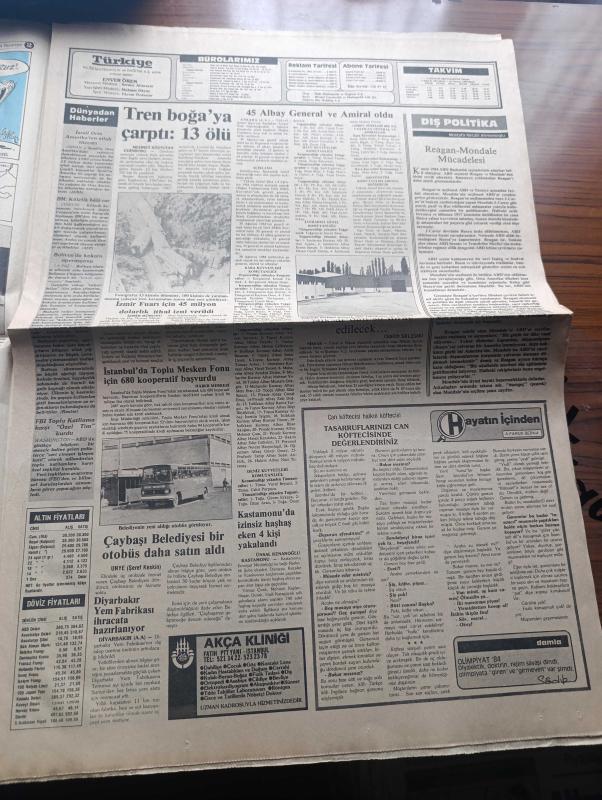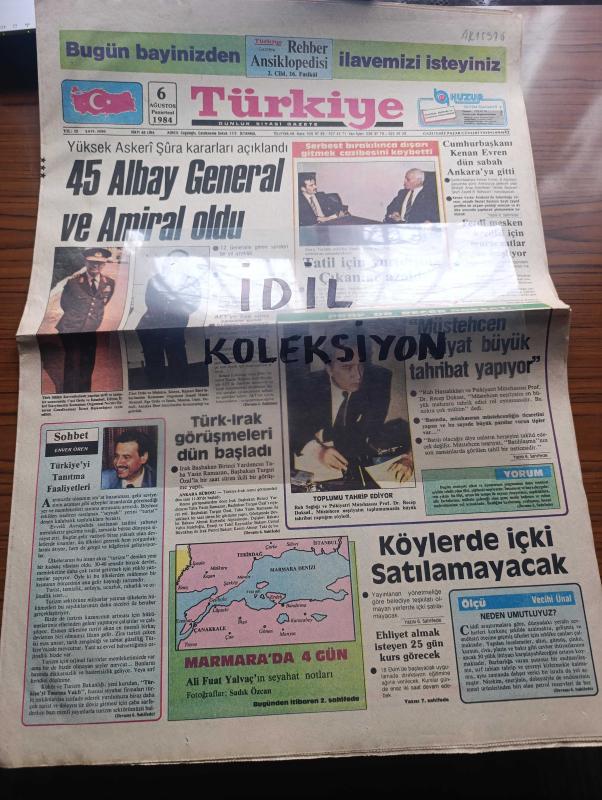 Türkiye Gazetesi - Turkish Newspaper - 6 Ağustos 1984 - Türkiye'yi tanıtma faaliyetleri yazan Enver Ören Başmakale - yüksek askeri şura kararları açıklandı 45 Albay General ve Amiral oldu - Edirne illeri sıkıyönetim komutanı Orgeneral Necdet Öztorun genelkurmay ikinci başkanlığına tayin edildi fotoğraf - Profesör Doktor Recep Doksat müstehcen neşriyat büyük tahribat yapıyor dedi - Cumhurbaşkanı Kenan Evren dün sabah Ankara'ya gitti - köylerde içki satılamayacak - Türk Irak görüşmeleri dün başladı - İzmir fuarı için 45 milyon dolarlık ithal izni verildi - Resimli Evliya Çelebi seyahatnamesi hazırlayan Kemal Akmeriç Desen Samim Utkun Yazı Dizisi - Peygamberler tarihi yazan Abdüllatif Uyan Yazı Dizisi - Al Baraka Ve Faisal isimli iki finans kurumu teşkil edildi - olimpiyatların tadı kalmadı - olimpiyatlarda madalya durumu - 100 metrede koşacak olan 1980 Moskova Olimpiyatları şampiyonu Allan Wells - boksörümüz Eyüp Can madalya için ringte - Semra Aksu'da seçmelerde elendi - sutopu adlı eser, Kitap > Süreli Yayınlar > Gazeteler > Türkiye > Genel > Günlük kategorisinde İkinci El olarak satıştadır.