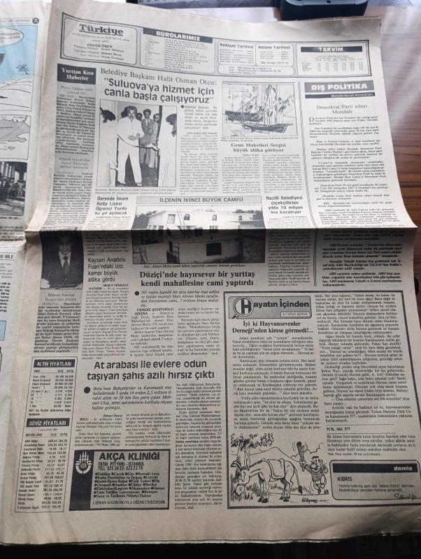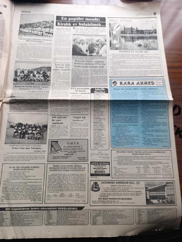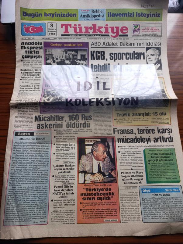 Türkiye Gazetesi - Turkish Newspaper - 8 Ağustos 1984 - model ve insan yazan Yalçın Özer Başmakale - ABD adalet bakanı William French'in iddiası KGB sporcuları tehdit etmiş - intibak kuyruğu - Mücahitler 160 Rus askerini öldürdü - Fransa teröre karşı mücadeleyi arttırdı - meşhur İtalyan rejisörü Fellini TV'nin esaretinde kalan insanlar gerçeği göremiyor dedi - gazeteci yazar Vecihi Ünal Türkiye'de müstehcenlik sınırı aşıldı - TRT yayın programı - Resimli Evliya Çelebi seyahatnamesi hazırlayan Kemal Akmeriç Desen Samim Utkun Yazı Dizisi - Peygamberler tarihi yazan Abdüllatif Uyan Yazı Dizisi - Galatasaray 800 milyon harcadığı transferden sonra arzu etti oyunu hala oynayamadı fotoğraf - ABD atletizmde de altınları kimseye bırakmıyor - Olimpikarikatür - Galatasaray kalecisi Simoviç taraftarlarına korkulu dakikalar yaşatıyor fotoğraf - 1984'ün şampiyonu Trabzonspor beklenilen başarıyı gösteremedi fotoğraf - patates ve kuru soğan ithalinde gümrük vergisi alınmayacak -ASALA Türk ekibi tehdit, Enver Ören tarafından kaleme alınmıştır. Türkiye Gazetesi - Turkish Newspaper - 8 Ağustos 1984 - model ve insan yazan Yalçın Özer Başmakale - ABD adalet bakanı William French'in iddiası KGB sporcuları tehdit etmiş - intibak kuyruğu - Mücahitler 160 Rus askerini öldürdü - Fransa teröre karşı mücadeleyi arttırdı - meşhur İtalyan rejisörü Fellini TV'nin esaretinde kalan insanlar gerçeği göremiyor dedi - gazeteci yazar Vecihi Ünal Türkiye'de müstehcenlik sınırı aşıldı - TRT yayın programı - Resimli Evliya Çelebi seyahatnamesi hazırlayan Kemal Akmeriç Desen Samim Utkun Yazı Dizisi - Peygamberler tarihi yazan Abdüllatif Uyan Yazı Dizisi - Galatasaray 800 milyon harcadığı transferden sonra arzu etti oyunu hala oynayamadı fotoğraf - ABD atletizmde de altınları kimseye bırakmıyor - Olimpikarikatür - Galatasaray kalecisi Simoviç taraftarlarına korkulu dakikalar yaşatıyor fotoğraf - 1984'ün şampiyonu Trabzonspor beklenilen başarıyı gösteremedi fotoğraf - patates ve kuru soğan ithalinde gümrük vergisi alınmayacak -ASALA Türk ekibi tehdit adlı eser Türkçe dilindedir.
