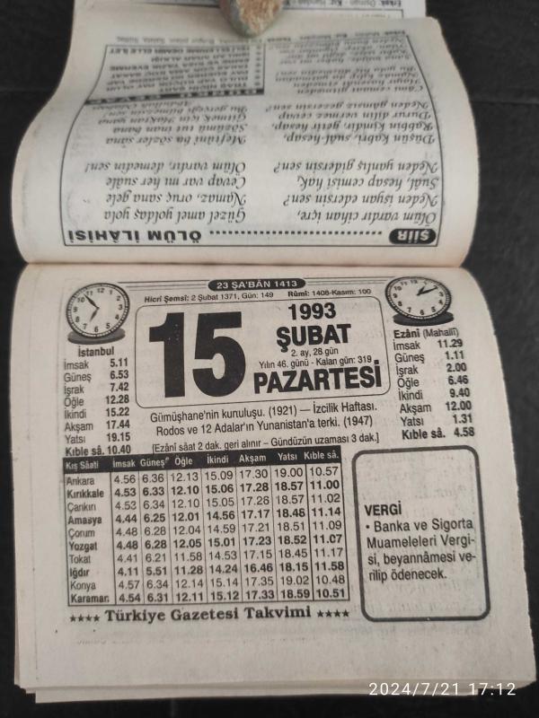 Türkiye Gazetesi takvimi 15 Şubat 1993 doğum günü hediyesi hediyelik takvim yaprağı, en son 1 yıl önce güncellenmiştir.