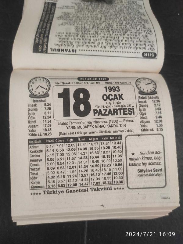 Türkiye Gazetesi takvimi 18 Ocak 1993 doğum günü hediyesi hediyelik takvim yaprağı, en son 1 yıl önce güncellenmiştir.
