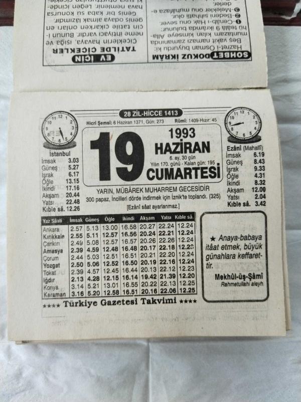 Türkiye Gazetesi takvimi 19 Haziran 1993 doğum günü hediyesi hediyelik takvim yaprağı, en son 1 yıl önce güncellenmiştir.
