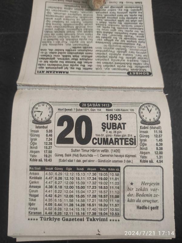 Türkiye Gazetesi takvimi 20 Şubat 1993 doğum günü hediyesi hediyelik takvim yaprağı, en son 1 yıl önce güncellenmiştir.