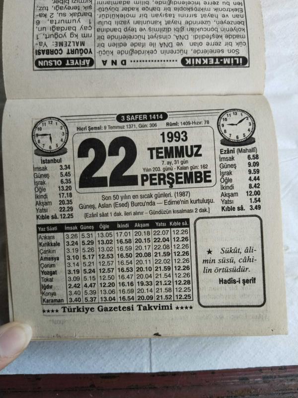 Türkiye Gazetesi takvimi 22 Temmuz 1993 doğum günü hediyesi hediyelik takvim yaprağı, en son 1 yıl önce güncellenmiştir.