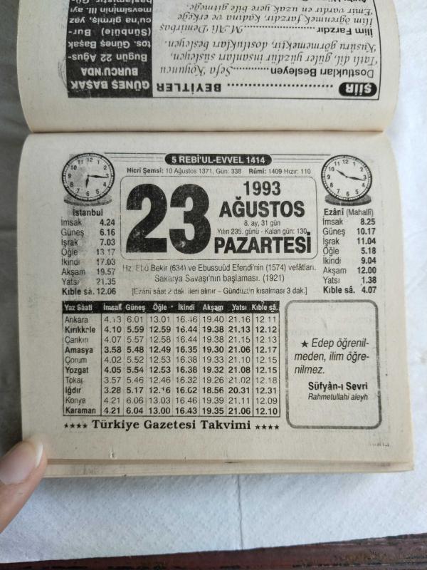 Türkiye Gazetesi takvimi 23 Ağustos 1993 doğum günü hediyesi hediyelik takvim yaprağı, 1 yıl önce satışa sunulmuştur.