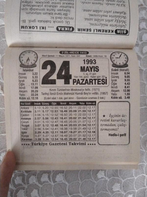 Türkiye Gazetesi takvimi 24 Mayıs 1993 doğum günü hediyesi hediyelik takvim yaprağı, en son 1 yıl önce güncellenmiştir.