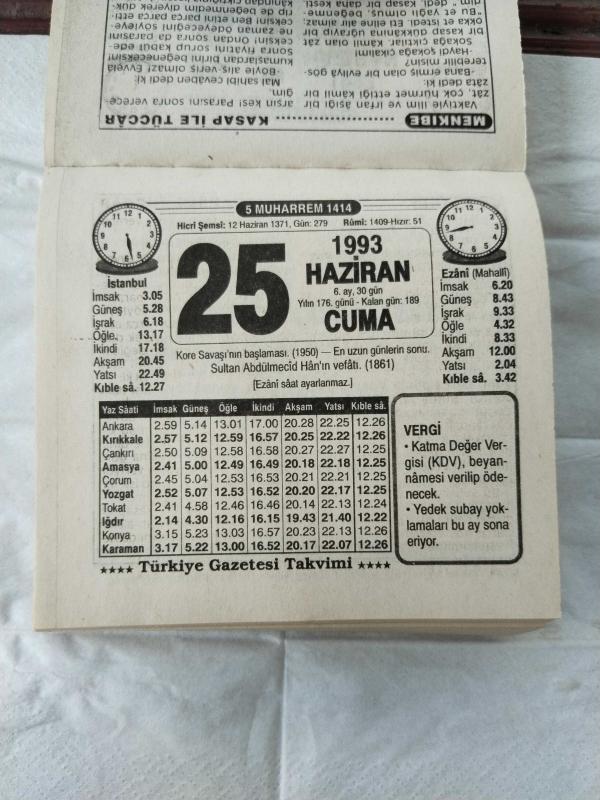 Türkiye Gazetesi takvimi 25 Haziran 1993 doğum günü hediyesi hediyelik takvim yaprağı, en son 1 yıl önce güncellenmiştir.