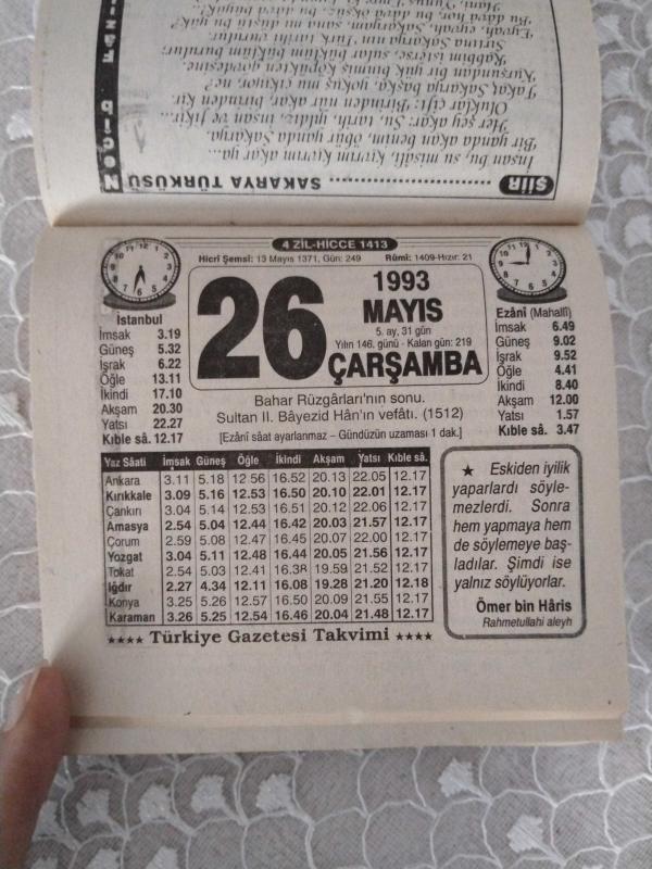 Türkiye Gazetesi takvimi 26 Mayıs 1993 doğum günü hediyesi hediyelik takvim yaprağı, en son 1 yıl önce güncellenmiştir.