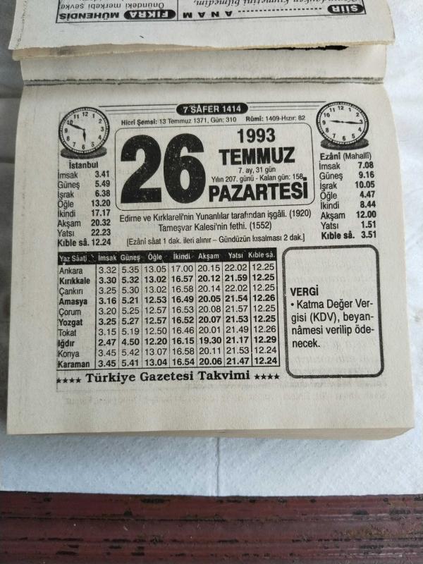 Türkiye Gazetesi takvimi 26 Temmuz 1993 doğum günü hediyesi hediyelik takvim yaprağı, en son 1 yıl önce güncellenmiştir.