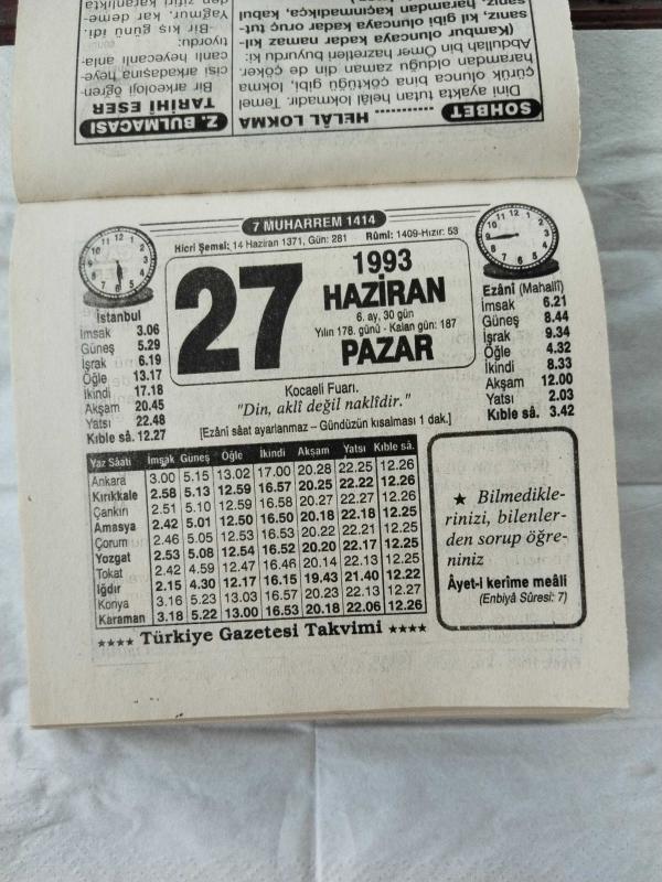 Türkiye Gazetesi takvimi 27 Haziran 1993 doğum günü hediyesi hediyelik takvim yaprağı, en son 1 yıl önce güncellenmiştir.