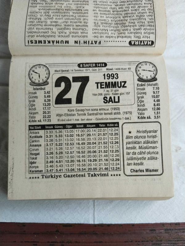 Türkiye Gazetesi takvimi 27 Temmuz 1993 doğum günü hediyesi hediyelik takvim yaprağı, en son 1 yıl önce güncellenmiştir.