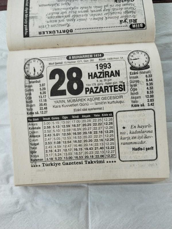 Türkiye Gazetesi takvimi 28 Haziran 1993 doğum günü hediyesi hediyelik takvim yaprağı, en son 1 yıl önce güncellenmiştir.
