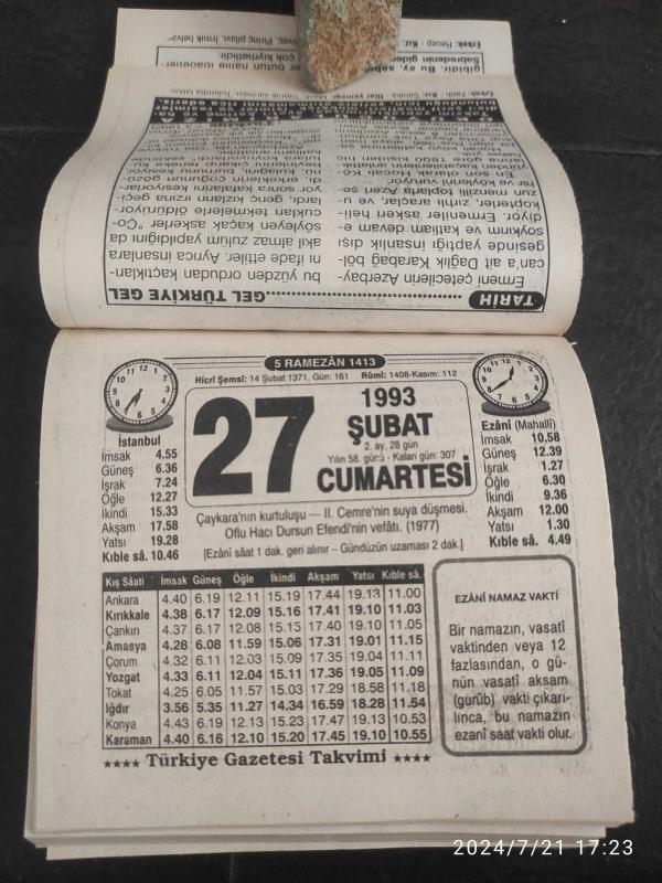 Türkiye Gazetesi takvimi 28 Şubat 1993 doğum günü hediyesi hediyelik takvim yaprağı