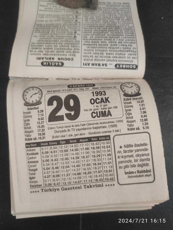 Türkiye Gazetesi takvimi 29 Ocak 1993 doğum günü hediyesi hediyelik takvim yaprağı, en son 1 yıl önce güncellenmiştir.