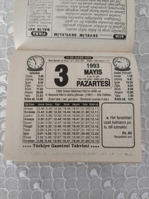 Türkiye Gazetesi takvimi 3 Mayıs 1993 doğum günü hediyesi hediyelik takvim yaprağı, en son 1 yıl önce güncellenmiştir.