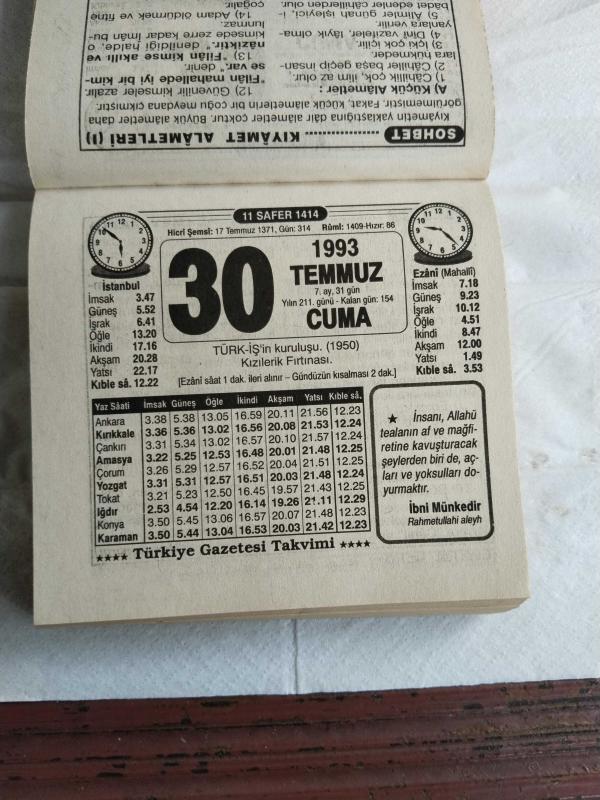Türkiye Gazetesi takvimi 30 Temmuz 1993 doğum günü hediyesi hediyelik takvim yaprağı, en son 1 yıl önce güncellenmiştir.