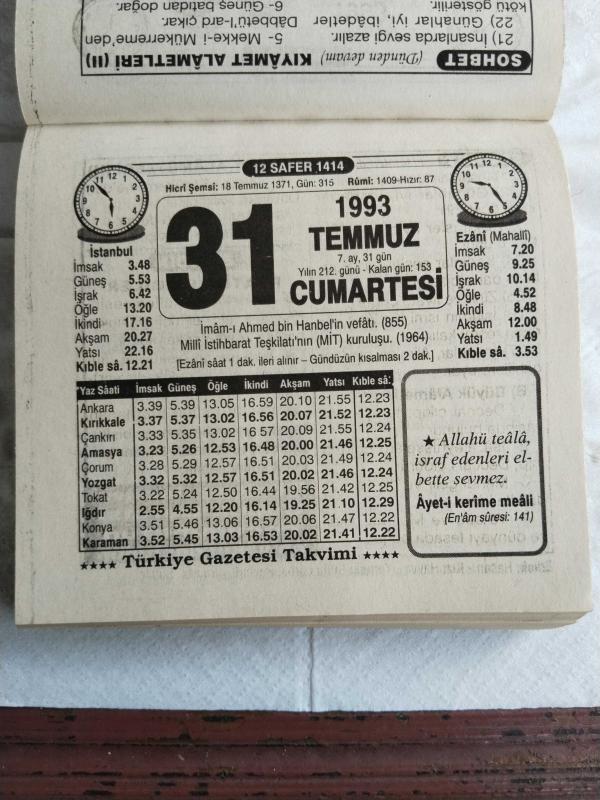 Türkiye Gazetesi takvimi 31 Temmuz 1993 doğum günü hediyesi hediyelik takvim yaprağı, en son 1 yıl önce güncellenmiştir.