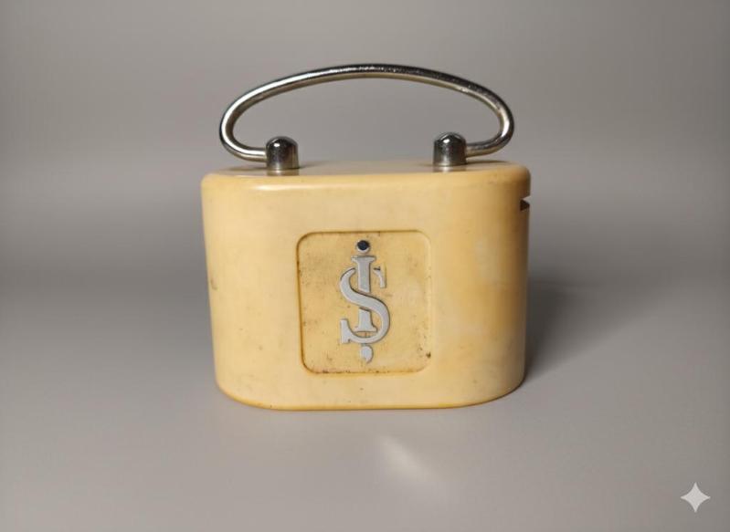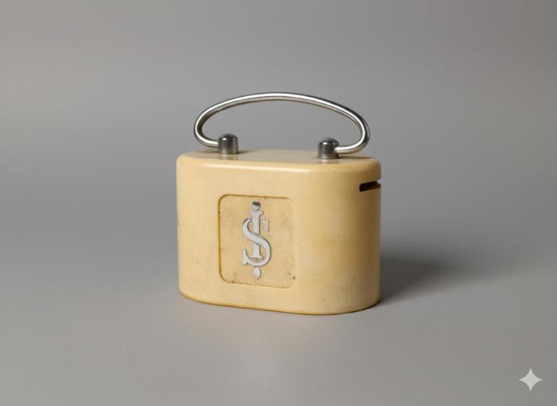 Bu özel parça, Türkiye İş Bankası'nın tasarruf kampanyaları kapsamında üretilmiş, 20. yüzyılın sonlarına doğru yaygınlaşan bir plastik kumbara örneğidir. Canlı krem rengi ve üzerindeki İş Bankası'nın ikonik "İ-Ş" birleşimli logosu, dönemin modern ve işlevsel tasarım anlayışını yansıtır. Metal versiyonlarının aksine, bu plastik kumbaralar daha hafif ve geniş kitlelere ulaşmak için tasarlanmıştır. Bu durum, onları günlük hayatta daha sık kullanılan ve dolayısıyla daha fazla hatıra biriktiren objeler haline getirmiştir. Üzerindeki hafif çizikler ve renk solmaları, bu parçanın bir ailenin veya çocuğun tasarruf yolculuğuna nasıl eşlik ettiğinin sessiz tanıklarıdır. Bu kumbara, hem eski bir reklam objesi hem de Türkiye'nin yakın geçmişinde çocuklara ve gençlere para biriktirme alışkanlığı kazandırmayı amaçlayan bir kültürün simgesidir. Nostaljik bir dekor parçası olarak veya bir İş Bankası koleksiyonunun tamamlayıcısı olarak sergilenebilir. Kurum: Türkiye İş Bankası Dönem: 20. yüzyıl sonları Malzeme: Plastik Durum: Hafif yıpranmış, orijinal haliyle.