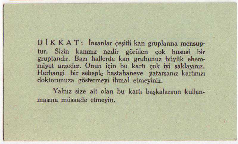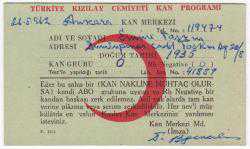 Ankara Kızılay Kan Merkezi tarafından 22 Mayıs 1962'de verilmiş kan grubunu gösteren kart.