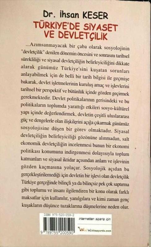 Türkiye'de Siyaset ve Devletçilik, Dr. İlhan Keser tarafından kaleme alınmıştır. Kitap 2000 yılında Gündoğan Yayınları tarafından yayınlanmıştır. 186 sayfadır. Türkiye'de Siyaset ve Devletçilik adlı eser Türkçe dilindedir.