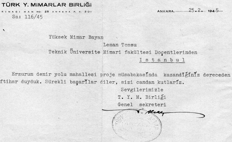 Türkiyenin ilk 2 kadın mimarından Leman Tomsu. Erzurum demiryolu projesini kazanma mektubu 1945, en son 2 yıl önce güncellenmiştir.