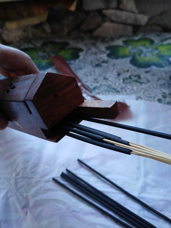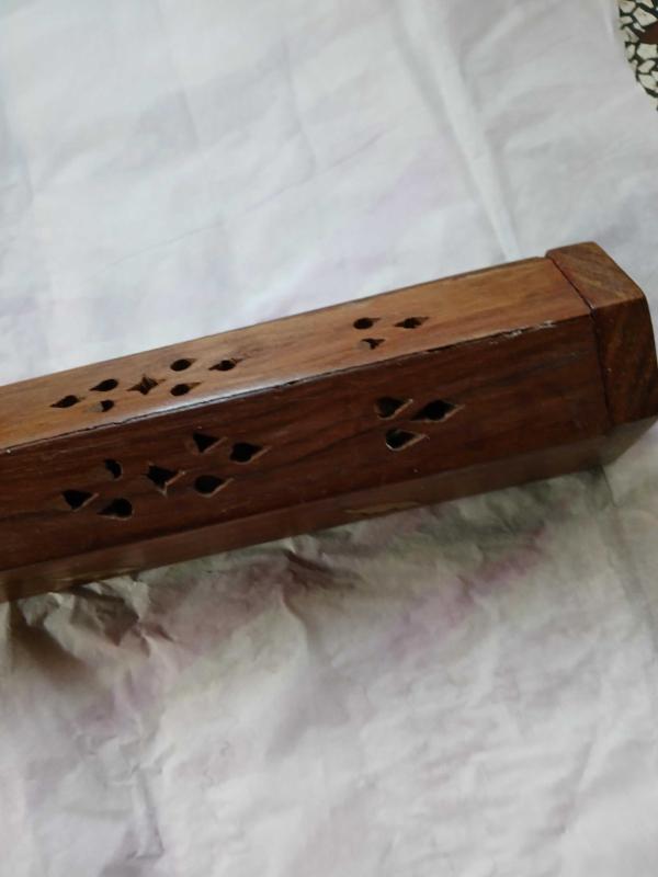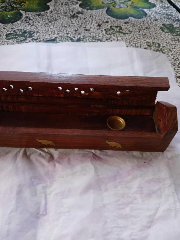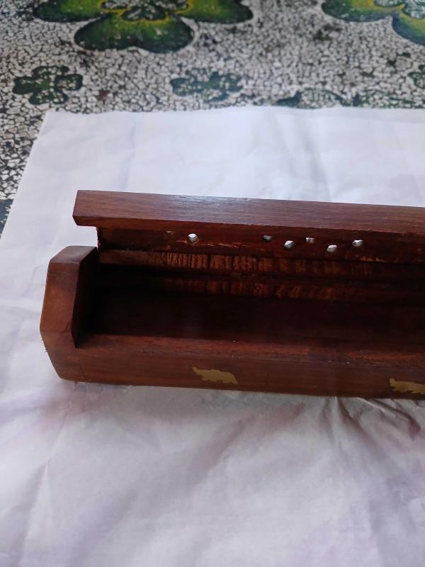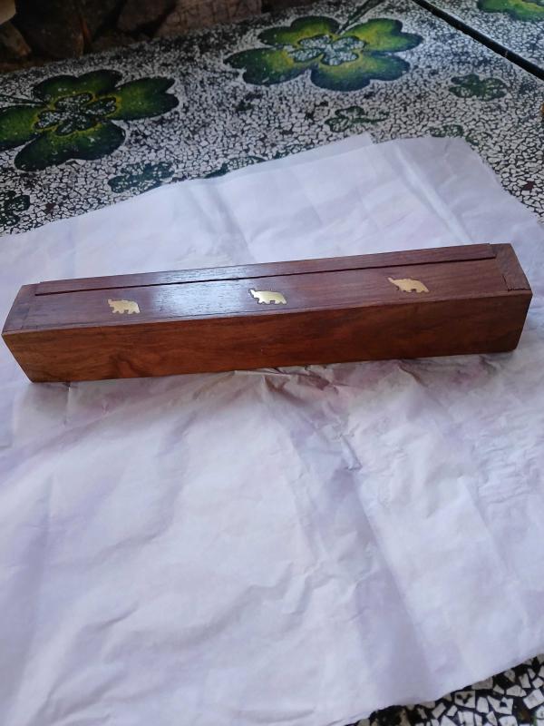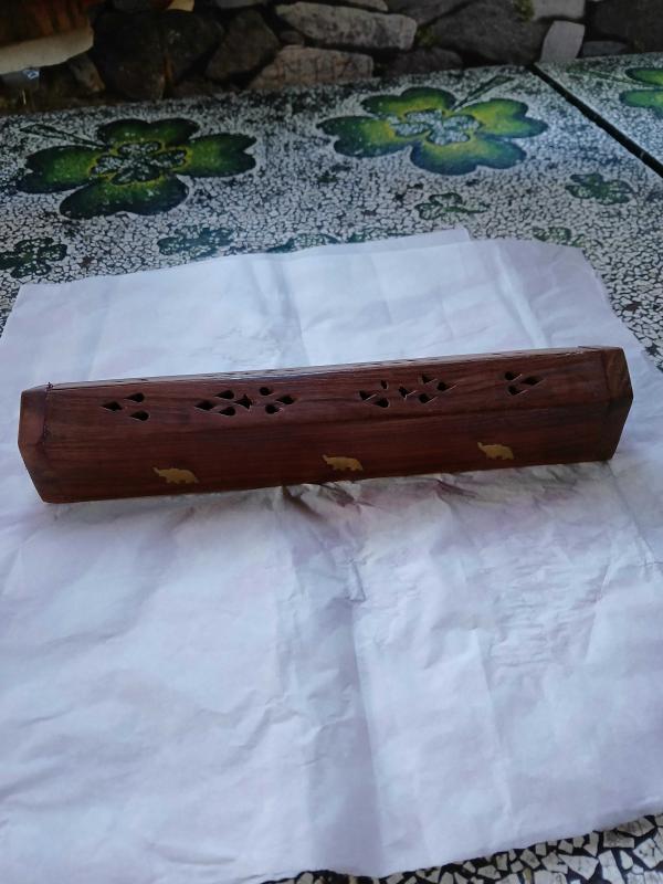 Ahşaptan yapılmış tütsü kutusu el işlemeli üzerinde fil resimleri var yan tarafında kapaklı tütsü koyma yeri var resimlerde görüldüğü gibi ölçüleri:(uzunluk:27cm) (yükseklik:7cm) görüldüğü üzere tütsüler de fiata dahil dir.