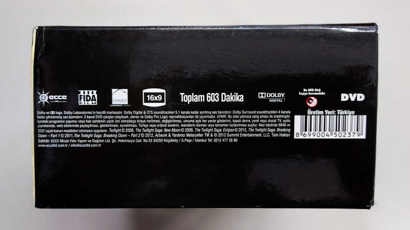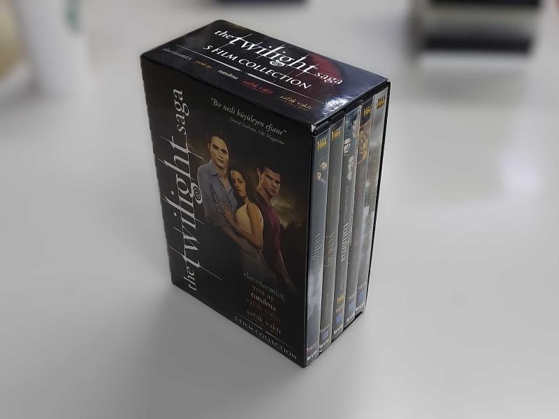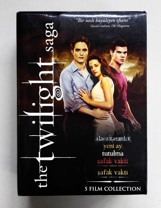 2013 yılında koleksiyonerler için özel olarak basılmış, Twilight ( Alacakaranlık ) serisinin tüm filmlerini içeren özel DVD box set. 13 yıl önce üretilmesine rağmen diskler sıfır ayarında, çiziksizdir. Hepsi test edilmiştir, sorunsuz çalışmaktadır. Son derece nadir bir settir. Tüm filmlerde Türkçe dublaj ve Türkçe altyazı mevcuttur. Kutunun altındada yazdığı üzere ; tüm filmlerin toplam ekran süresi 603 dakika yani yaklaşık 10 saattir. Ana filmlere ek olarak diskler içerisinde uzatılmış sahneler, röportajlar ve kamera arkası gibi ekran süresini tatmin edici derecede uzatan daha bir çok özel seçenek mevcuttur. Serinin hayranları için bulunması son derece zor, nadir ve koleksiyonluk bir settir.