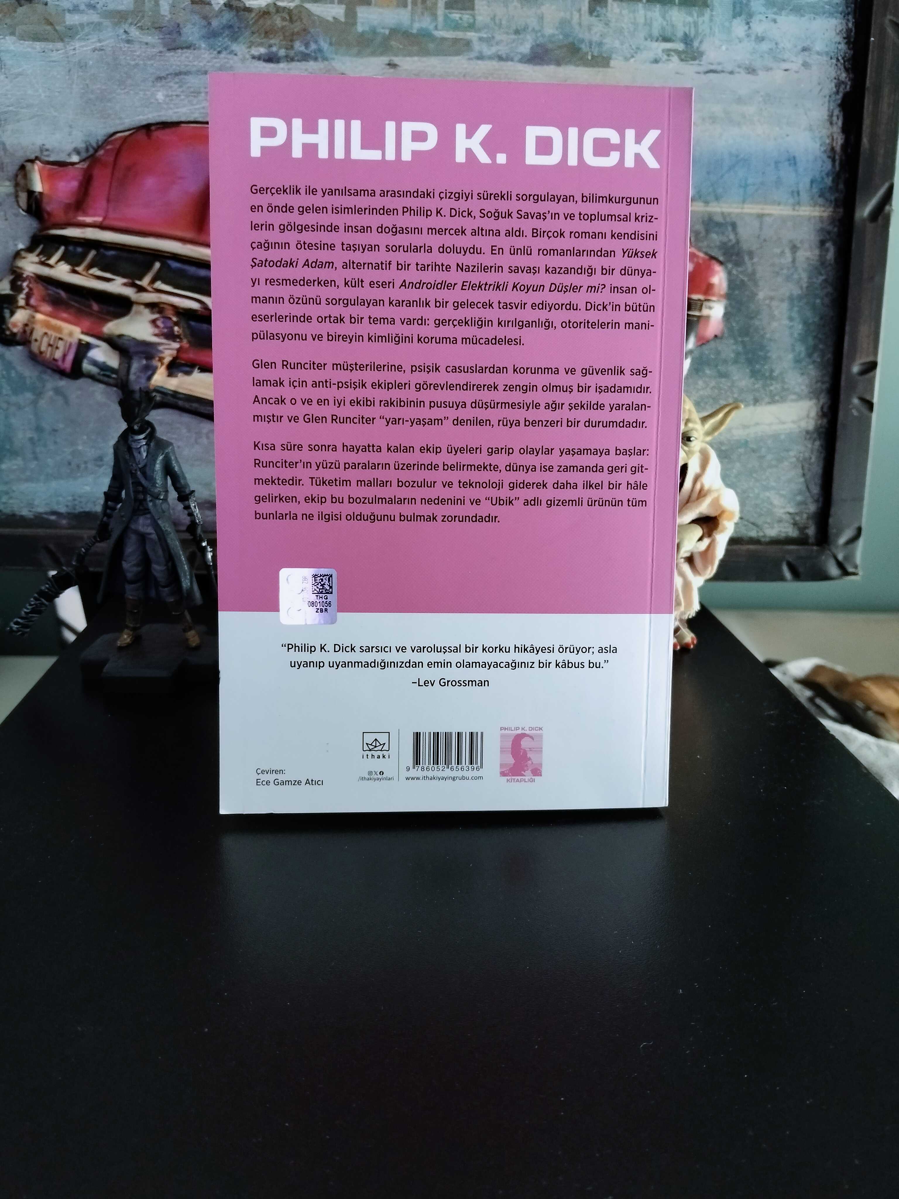 Gerçeklik ile yanılsama arasındaki çizgiyi sürekli sorgulayan, bilimkurgunun en önde gelen isimlerinden Philip K. Dick, Soğuk Savaş’ın ve toplumsal krizlerin gölgesinde insan doğasını mercek altına aldı. Birçok romanı kendisini çağının ötesine taşıyan sorularla doluydu. En ünlü romanlarından Yüksek Şatodaki Adam, alternatif bir tarihte Nazilerin savaşı kazandığı bir dünyayı resmederken, kült eseri Androidler Elektrikli Koyun Düşler mi? insan olmanın özünü sorgulayan karanlık bir gelecek tasvir ediyordu. Dick’in bütün eserlerinde ortak bir tema vardı: gerçekliğin kırılganlığı, otoritelerin manipülasyonu ve bireyin kimliğini koruma mücadelesi. Glen Runciter müşterilerine, psişik casuslardan korunma ve güvenlik sağlamak için anti-psişik ekipleri görevlendirerek zengin olmuş bir işadamıdır. Ancak o ve en iyi ekibi rakibinin pusuya düşürmesiyle ağır şekilde yaralanmıştır ve Glen Runciter “yarı-yaşam” denilen, rüya benzeri bir durumdadır. Kısa süre sonra hayatta kalan ekip üyeleri garip olaylar yaşamaya başlar: Runciter’ın yüzü paraların üzerinde belirmekte, dünya ise zamanda geri gitmektedir. Tüketim malları bozulur ve teknoloji giderek daha ilkel bir hâle gelirken, ekip bu bozulmaların nedenini ve “Ubik” adlı gizemli ürünün tüm bunlarla ne ilgisi olduğunu bulmak zorundadır. “Philip K. Dick sarsıcı ve varoluşsal bir korku hikâyesi örüyor; asla uyanıp uyanmadığınızdan emin olamayacağınız bir kâbus bu.” –Lev Grossman