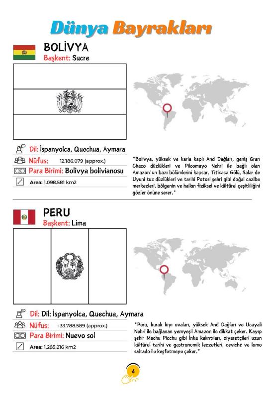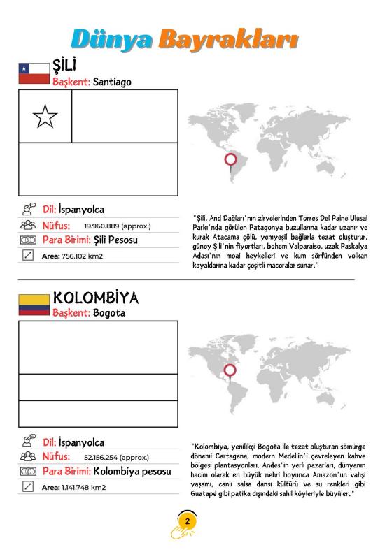 ÜLKELER ve BAYRAKLARI BOYAMA KİTABI (TÜM ÜLKELER) Hem Boya… Hem Keşfet… Hem Öğren! Dünyayı hiç bu kadar eğlenceli tanımadınız! Bu kitap sadece bir boyama kitabı değil… Aynı zamanda mini bir coğrafya atlası, bir genel kültür rehberi ve çocuklar için eşsiz bir dünya keşif yolculuğu! Her sayfada: Ülkenin bayrağını boyama alanı Ülkenin dünya haritası üzerindeki konumu Başkenti Para birimi Yüzölçümü Nüfusu Resmi dili Ülke hakkında kısa ve akılda kalıcı tanıtım bilgisi Çocuklar sadece bayrak boyamıyor… Boyarken öğreniyor, öğrenirken dünyayı keşfediyor! ________________________________________ Neden Bu Kitap? Coğrafya bilgisini erken yaşta kazandırır. Genel kültürü güçlendirir. El becerisini ve dikkat gelişimini destekler. Okul derslerine katkı sağlar. Ailece keyifli zaman geçirmenizi sağlar. ________________________________________ Özellikle: • İlkokul ve ortaokul öğrencileri • Bursluluk sınavına hazırlananlar • Genel kültürünü artırmak isteyenler • Dünya ülkelerini eğlenerek öğrenmek isteyen herkes için mükemmel! ________________________________________ Çocuğunuza sadece bir kitap değil, DÜNYA’YI hediye edin! Bayrakları renklendirirken, kıtaları dolaşacak, başkentleri öğrenecek, dünyaya bakışı değişecek! Bu kitap evde olmalı. Çünkü dünyayı tanıyan çocuklar, geleceği daha güçlü kurar. Şimdi sipariş verin, keşif başlasın!