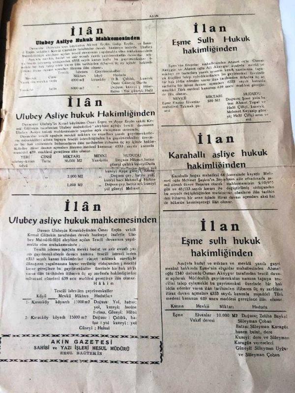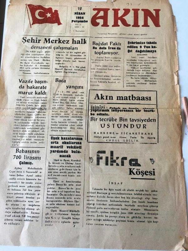 UŞAK AKIN GAZETESİ YEREL TAŞRA BASINI --12 NİSAN 1956 YIL :1 SAYI :42- Şehir Merkez Halk Dershanesi Çalışmaları - Vazife başında hakarete maruz kaldı - Uşak kazalarının orta okullarına maarif vekaleti yardımında bulunacak - Bağdat Paktı Bu defa İran da Toplanıyor -- Şehrimizde tahsis edilen 9 ton kağıt dağıtılmaya başlandı - İlan Eşme Sulh Hukuk Hakimliğinden -- Yıpranma, sararmalar, kupon kesiği ve yırtılmalar zamana bağlı olarak görülebilir.