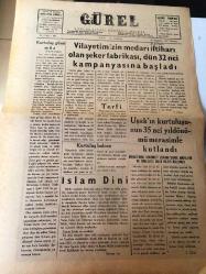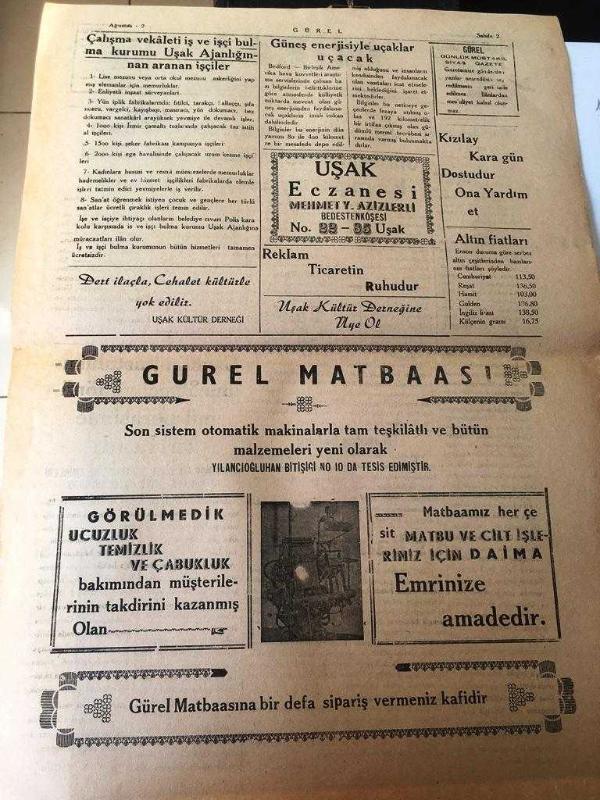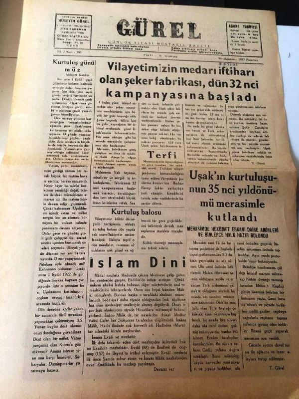 UŞAK GÜREL GAZETESİ YEREL TAŞRA BASINI ---2 Eylül 1957 Yıl :2 Sayı :381- Kurtuluş günümüz - Vilayetimizin medarı iftiharı olan şeker fabrikası ,dün 32 . kampanyası başladı -- Terfi Vilayetimizin Jandarma Kumandanı Binbaşı Recep Işıklar Yarbaylığa Terfi Etmiştir -- Kurtuluş Balosu --İslam Dini - Uşak 'ın kurtuluşun 35. yıldönümü merasimle kutlandı --Güneş enerjisiyle uçaklar uçacak -- Yıpranma, sararmalar, kupon kesiği ve yırtılmalar zamana bağlı olarak görülebilir.