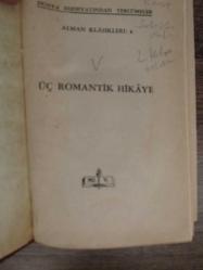 Üç Romantik Hikaye, Kleist;Chamisso;Hoffmann tarafından kaleme alınmıştır. Kitap 1943 yılında MAARİF MATBAASI tarafından yayınlanmıştır. Bu baskının çevirisi Sabahattin Ali tarafından yapılmıştır. 232 sayfadır. Üç Romantik Hikaye adlı eser Türkçe dilindedir.