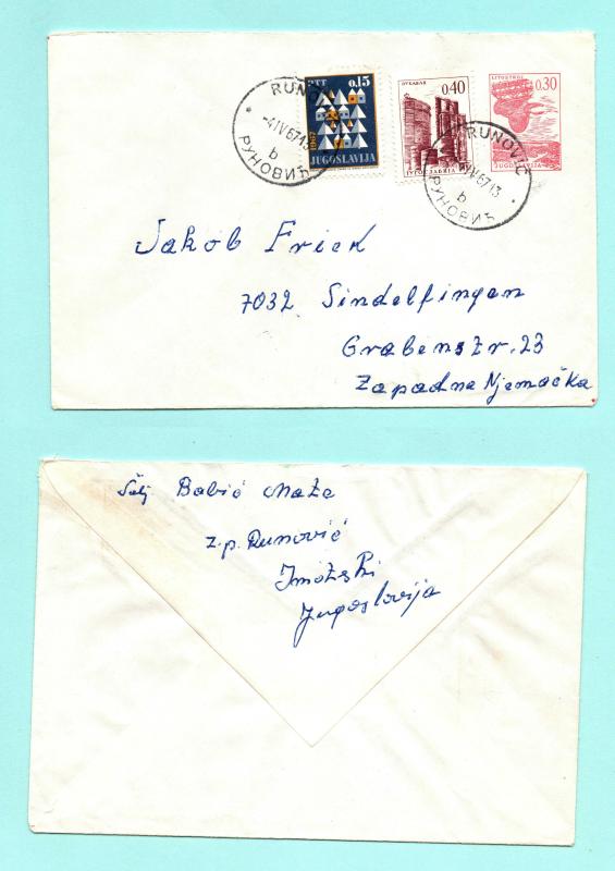 Üç farklı pulun bir arada kullanımı, okunaklı damgalar, Yugoslavya'dan Batı Almanya'ya kişisel mektup zarfı, 13 gün önce satışa sunulmuştur.