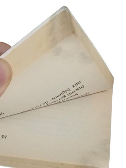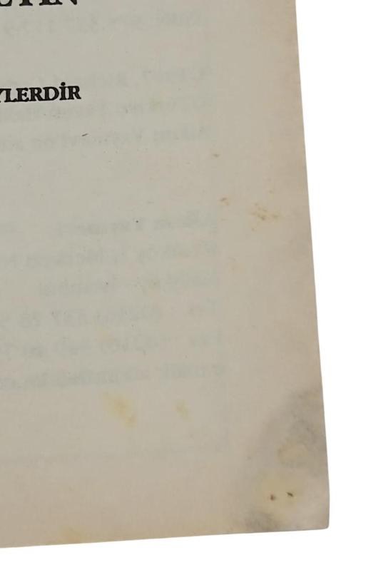 Kitabın en arka kapak kısmının iç kısmında, tükenmez kalemle yazı yazılmıştır.Resim 2 ve 3'teki gibi nemden dolayı lekeleri vardır.