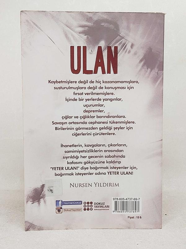 Ulan, Nursen Yıldırım tarafından kaleme alınmıştır. Kitap 2018 yılında Dokuz Yayınları tarafından [Konya] yayınlanmıştır. 176 sayfadır. Ulan adlı eser Türkçe dilindedir.