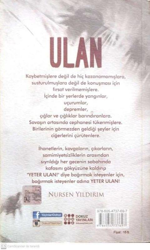Ulan, Nursen Yıldırım tarafından kaleme alınmıştır. Kitap 2016 yılında Dokuz tarafından yayınlanmıştır. 176 sayfadır. Ulan adlı eser Türkçe dilindedir.