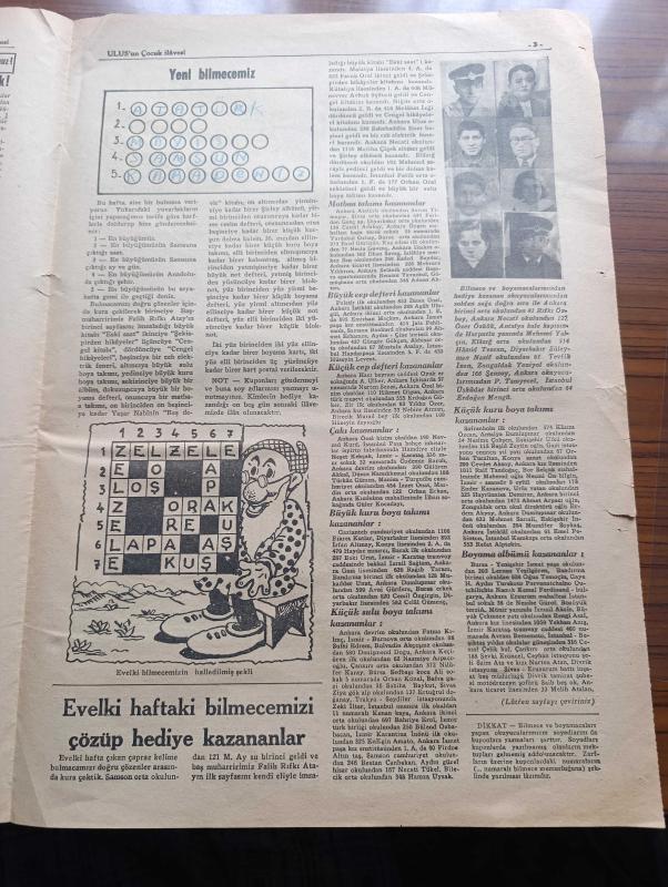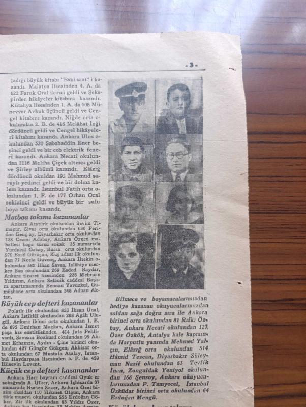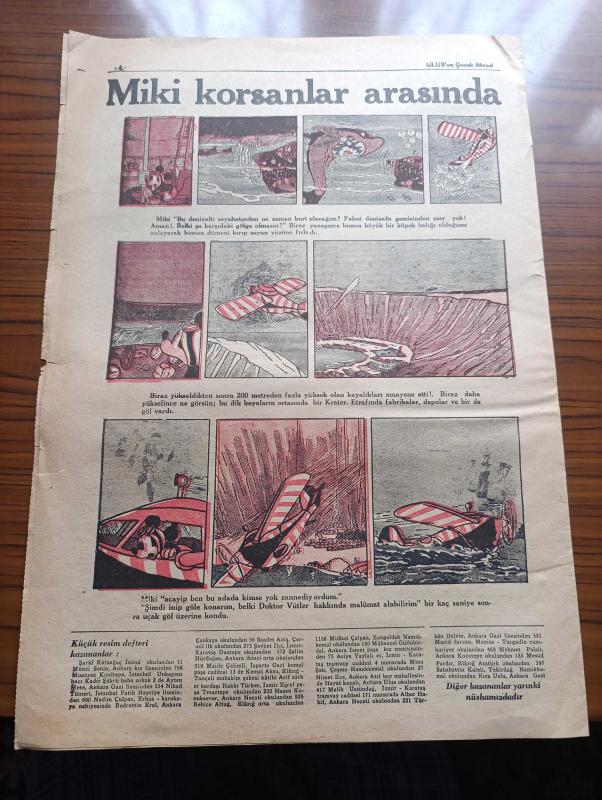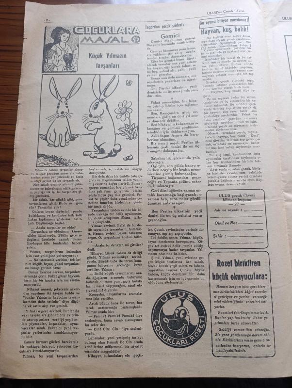 Ulus Çocukları Gazetesi - Turkish Newspaper - 8 Mayıs 1938 - sevgili çocuklara - büyük şefimiz Atatürk 19 Mayıs'ın 19. günü Samsun ayak basmıştı - 19 Mayıs Gençlik ve Spor bayramından fotoğraflar - 19 Mayıs şiiri - çocuklara masal küçük Yılmaz'ın tavşanları - bu oyunu biliyor muydunuz hayvan kuş balık - Tagordan çocuk şiirleri Gemici - rozet biriktiren küçük oyunculara - yeni bilmecemiz - bilmece ve boyamacalarımızdan hediye kazanan okuyucularımızdan soldan sağa sıra ile Ankara birinci ortaokulundan 81 Rıfkı Özbay Ankara Necati okulundan 127 Özer Özkök Antalya kale kapısından Harputlu yanında Mehmet Yalçın Elazığ ortaokulundan 514 Hamit Tezcan Diyarbakır Süleyman Nazif okulundan 61 Tevfik inan Zonguldak Yeniyol okulundan 166 Şensoy Ankara okuyucularımızdan P.Tamyecel İstanbul Üsküdar birinci ortaokulundan 64 Erdoğan Mengü Fotoğrafı - Miki Mouse korsanlar arasında karikatür - matbaa takımı kazananlar Ankara Atatürk okulu'ndan Sevim Timagur - büyük cep defteri kazanan İhsan Ünal adlı eser Türkçe dilindedir.