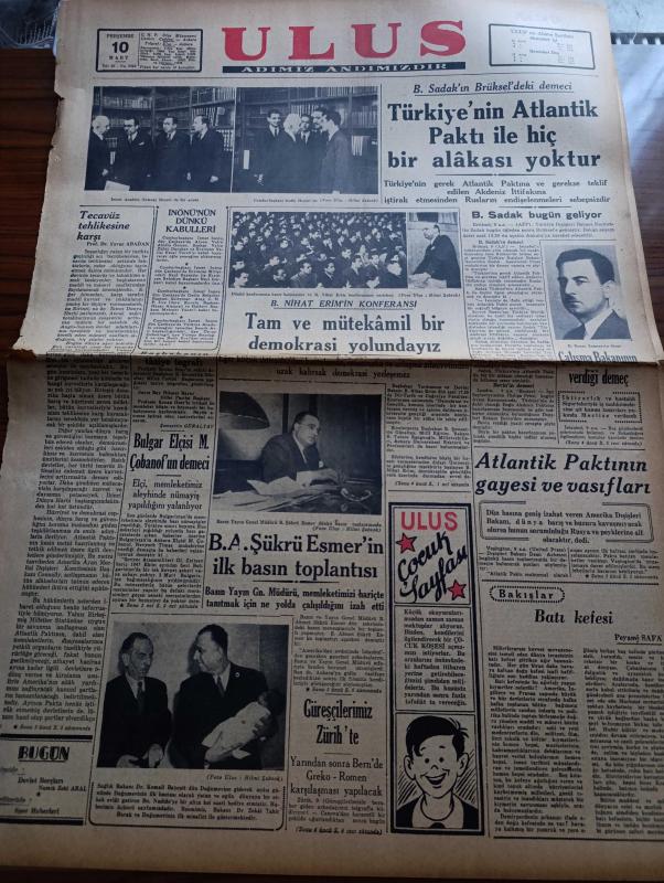 Ulus Gazetesi - 10 Mart 1949 - Peyami Safa Köşe Yazısı - Profesör Doktor Yavuz Abadan Köşe Yazısı - Türkiye'nin Atlantik Paktı İle Hiç Bir Alakası Yoktur - Başbakan Şemseddin Günaltay'ın Profesör Kenan Öner'in Vefatı Dolasıyla Taziye Telgrafı - Basın Yayın Genel Müdürü Ahmet Şükrü Esmerin İlk Basın Toplantısı - Atlantik Paktı'nın Gayesi Ve Vasıfları - Nihat Erim'in Konferansı - Kaçırılan Kızlar Yazan Gerard Fairlie Yazı Dizisi - İçel Milletvekili Saim Ergenekon Vefat Etti - Kızılay Balosunun Hazırlıkları Bitti - Yeni Bir Pul Serisi - Cemil Sait Barlas Hereke Ve İzmit Fabrikalarını Gezdi - Sütlüce'de İnfilak Eden Nuri Killigil Fabrikasına Dair Bir İddia - Eti Vapurundaki Hadise Yalanlanıyor - Sağlık Bakanı Kemali Bayezit Cebeci Yeni Doğumevinde - Cemiyet Hayatı - Filistin İçin Çarpıştığımız Günler Yazan M. Şevki Yazman- İnönü Kır Koşusu Bölge Birinciliği - Haftanın Lig Maçları - Harbiye'den Sahir Milli Takımda - Bomonti Aile Saz Salonu - Sabite Tur Gülerman - Efe Aşkı Filmi adlı eser, Kitap > Süreli Yayınlar > Gazeteler > Türkiye > Genel > Günlük kategorisinde İkinci El olarak satıştadır.