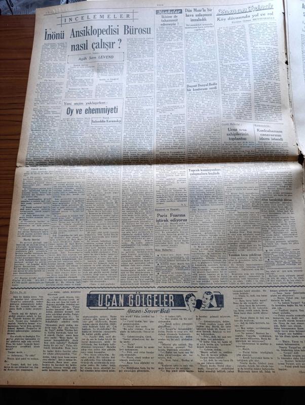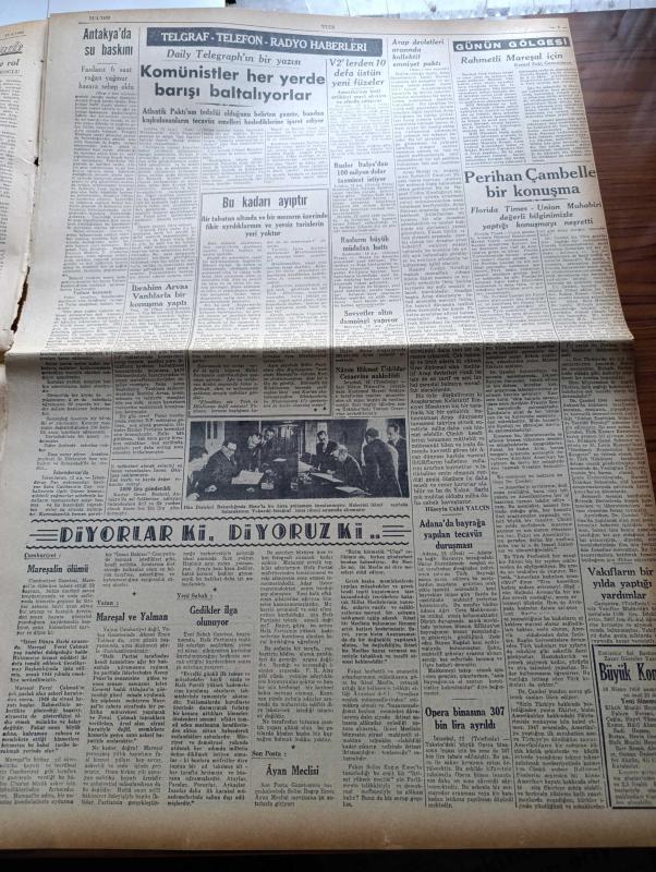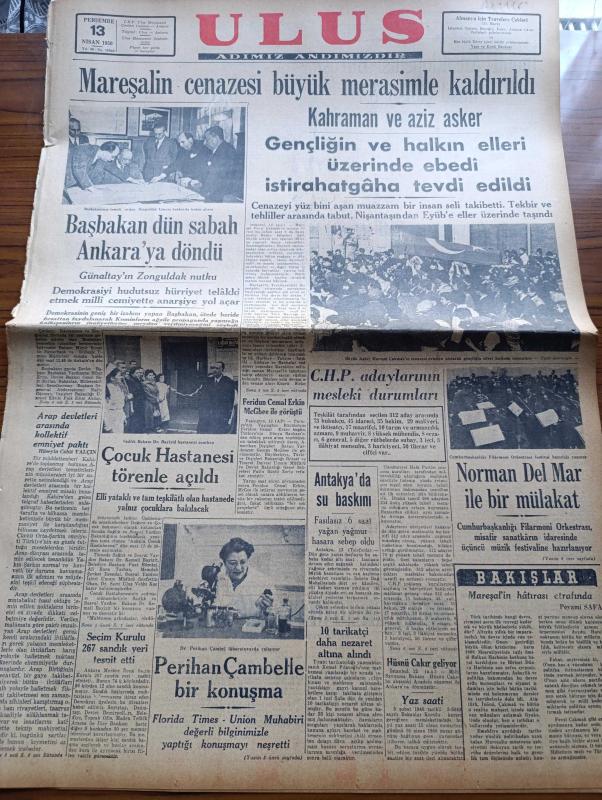 Ulus Gazetesi - 13 Nisan 1950 - Mareşal Fevzi Çakmak'ın Cenazesi Büyük Bir Merasimle Kaldırıldı - Mareşal Fevzi Çakmak'ın Tabutu Tekbirlerle Nişantaşı'ndan Eyüp'e Eller Üzerinde Taşındı - Peyami Safa Köşe Yazısı - Hüseyin Cahit Yalçın Köşe Yazısı - Başbakan Şemseddin Günaltay Zonguldak Limanı Hakkında İzahat Alıyor - Çocuk Hastanesi Törenle Açıldı - Profesör Perihan Çambel'le Bir Konuşma - Ticani Tarikatçılığı Yapmaktan Sanık Kemal Pilavoğlu - Antakya'da Su Baskını - Cumhurbaşkanı Filarmoni Orkestrası Misafiri Norman Del Mar İle Bir Mülakat - Uçan Gölgeler Yazan Server Bedi Yazı Dizisi - İnönü Ansiklopedisi Bürosu Nasıl Çalışır Yazan Agâh Sırrı Levend - Paris Fuarına İştirak Ediyoruz - Doçent Danyal Bediz Bir Konferans Verdi - Nazım Hikmet Üsküdar Cezaevine Nakledildi - Taksim'deki Büyük Opera Binası İnşaatı İçin 307 Bin Lira Ayrıldı - Ölümünün 13. Yıldönümünde Abdülhak Hamit Tarhan Yazan R. Necdet Evrimer - Yankee Paşa Yazan Edison Marshall Yazı Dizisi - Ulus Kupası Basketbol Maçları adlı eser, Kitap > Süreli Yayınlar > Gazeteler > Türkiye > Genel > Günlük kategorisinde İkinci El olarak satıştadır.