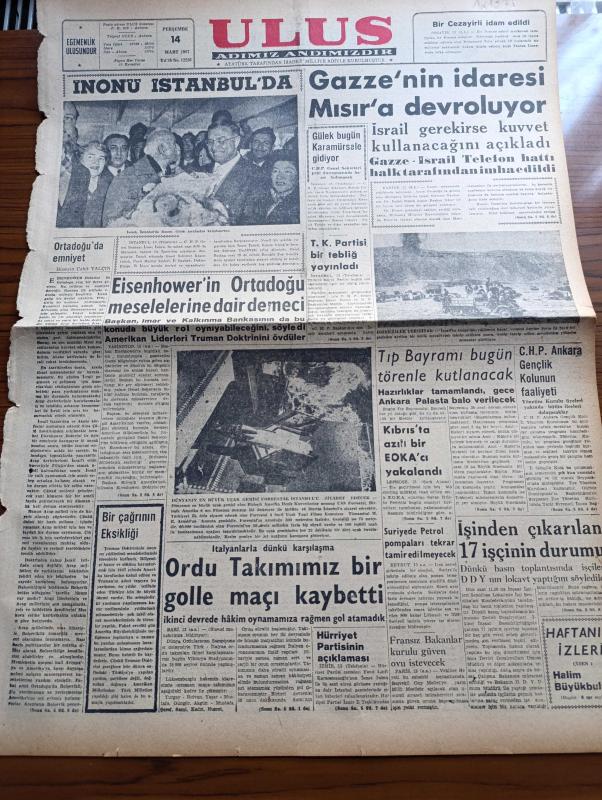 Ulus Gazetesi - 14 Mart 1957 - Hüseyin Cahit Yalçın - Devletkuşu Yazan Orhan Kemal Yazı Dizisi - İsmet İnönü İstanbul'da - Gazze'nin İdaresi Mısır'a Devroluyor - Türkiye Köylü Partisi Bir Tebliğ Yayınladı - Gazze İsrail Telefon Hattı Halk Tarafından İmha Edildi - Eisenhower'in Ortadoğu Meselelerine Dair Demeci - Tıp Bayramı Bugün Törenle Kutlanacak - Ordu Takımımız İtalya'ya Bir Golle Kaybetti - Kıbrıs'ta Azılı Bir EOKA'cı Yakalandı - Suriye'de Petrol Pompaları Tekrar Tamir Edilmeyecek Devlet Demir Yolları Lokavtı - Rock And Roll Liberace Yazan İlhan K. Mimaroğlu - Güney Doğu Asya'da Komünizmle Savaş - Beş Hasta Var Büyük Türk Filmi Başrolde Muzaffer Tema Nedret Güvenç - Arap Milliyetçiliği Ve Türkiye Yazan Bülent Ecevit - Yakup Kadri Karaosmanoğlu - Cep Tiyatrosu Yazan Orhan Kemal - Bugün Lider Ankaragücü Lig Altıncısı Yolspor İle Oynuyor - Okyayüz Kupası Boks Maçları - Silviya Kobay'ın Hikayesi Çizgi Roman - Baykara Hz. Süleymanın Taşı Çizgi Roman - Ankara Makarnası - Haftanın İzleri, Kasım Gülek tarafından kaleme alınmıştır. Ulus Gazetesi - 14 Mart 1957 - Hüseyin Cahit Yalçın - Devletkuşu Yazan Orhan Kemal Yazı Dizisi - İsmet İnönü İstanbul'da - Gazze'nin İdaresi Mısır'a Devroluyor - Türkiye Köylü Partisi Bir Tebliğ Yayınladı - Gazze İsrail Telefon Hattı Halk Tarafından İmha Edildi - Eisenhower'in Ortadoğu Meselelerine Dair Demeci - Tıp Bayramı Bugün Törenle Kutlanacak - Ordu Takımımız İtalya'ya Bir Golle Kaybetti - Kıbrıs'ta Azılı Bir EOKA'cı Yakalandı - Suriye'de Petrol Pompaları Tekrar Tamir Edilmeyecek Devlet Demir Yolları Lokavtı - Rock And Roll Liberace Yazan İlhan K. Mimaroğlu - Güney Doğu Asya'da Komünizmle Savaş - Beş Hasta Var Büyük Türk Filmi Başrolde Muzaffer Tema Nedret Güvenç - Arap Milliyetçiliği Ve Türkiye Yazan Bülent Ecevit - Yakup Kadri Karaosmanoğlu - Cep Tiyatrosu Yazan Orhan Kemal - Bugün Lider Ankaragücü Lig Altıncısı Yolspor İle Oynuyor - Okyayüz Kupası Boks Maçları - Silviya Kobay'ın Hikayesi Çizgi Roman - Baykara Hz. Süleymanın Taşı Çizgi Roman - Ankara Makarnası - Haftanın İzleri adlı eser Türkçe dilindedir.