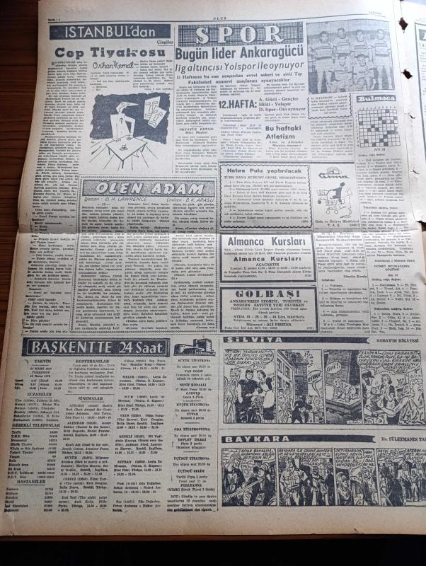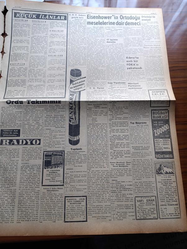 Ulus Gazetesi - 14 Mart 1957 - Hüseyin Cahit Yalçın - Devletkuşu Yazan Orhan Kemal Yazı Dizisi - İsmet İnönü İstanbul'da - Gazze'nin İdaresi Mısır'a Devroluyor - Türkiye Köylü Partisi Bir Tebliğ Yayınladı - Gazze İsrail Telefon Hattı Halk Tarafından İmha Edildi - Eisenhower'in Ortadoğu Meselelerine Dair Demeci - Tıp Bayramı Bugün Törenle Kutlanacak - Ordu Takımımız İtalya'ya Bir Golle Kaybetti - Kıbrıs'ta Azılı Bir EOKA'cı Yakalandı - Suriye'de Petrol Pompaları Tekrar Tamir Edilmeyecek Devlet Demir Yolları Lokavtı - Rock And Roll Liberace Yazan İlhan K. Mimaroğlu - Güney Doğu Asya'da Komünizmle Savaş - Beş Hasta Var Büyük Türk Filmi Başrolde Muzaffer Tema Nedret Güvenç - Arap Milliyetçiliği Ve Türkiye Yazan Bülent Ecevit - Yakup Kadri Karaosmanoğlu - Cep Tiyatrosu Yazan Orhan Kemal - Bugün Lider Ankaragücü Lig Altıncısı Yolspor İle Oynuyor - Okyayüz Kupası Boks Maçları - Silviya Kobay'ın Hikayesi Çizgi Roman - Baykara Hz. Süleymanın Taşı Çizgi Roman - Ankara Makarnası - Haftanın İzleri adlı eser, Kitap > Süreli Yayınlar > Gazeteler > Türkiye > Genel > Günlük kategorisinde İkinci El olarak satıştadır.