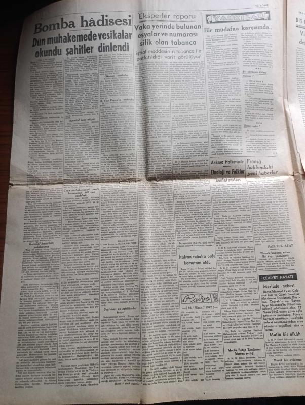 Ulus Gazetesi - 16 Nisan 1942 - Fransa hakkındaki yeni haberler yazan Falih Rıfkı Atay Başmakale - Büyük Millet meclisi'nde Türk inkılap tarihi Enstitüsü hakkındaki kanun projesi kabul edildi - CHP Genel sekreteri Fikri Tuzer Ankara'da fotoğraf - yeniden tedavi ile çıkarılacak olan 50 ve bir liralıklar fotoğraf - Merkez Bankası umum müdürü Kemal Zaim Sunel fotoğraf - bomba hadisesi dün muhakemede vesikalar okundu şahitler dinlendi - zeytinyağı ve sabun fiyatları - haftalar günlük ekmek kuponu karşılığında gluten ekmeği alabilecekler - Ankara Halkevinde Etnoloji ve folklor konferansları - radyo programı - Von Papen'e yapılmak istenen suikast - General Marshall Almanya'ya karşı büyük bir taarruz yapılmasını istiyor - Roosevelt'e göre müttefik devletler iki veya üç yılda mihveri yok edecek - filipinler'de Cebu hala dayanıyor - Birmanyada Japonlar ilerliyor - Zati Sungur yeni sinemada - Şark kundura baharı getirdi - Ankara Levazım amirliğine gelen ilanlar - kara yıldızlar Ulus sinemasında, İskender Artun tarafından kaleme alınmıştır. Ulus Gazetesi - 16 Nisan 1942 - Fransa hakkındaki yeni haberler yazan Falih Rıfkı Atay Başmakale - Büyük Millet meclisi'nde Türk inkılap tarihi Enstitüsü hakkındaki kanun projesi kabul edildi - CHP Genel sekreteri Fikri Tuzer Ankara'da fotoğraf - yeniden tedavi ile çıkarılacak olan 50 ve bir liralıklar fotoğraf - Merkez Bankası umum müdürü Kemal Zaim Sunel fotoğraf - bomba hadisesi dün muhakemede vesikalar okundu şahitler dinlendi - zeytinyağı ve sabun fiyatları - haftalar günlük ekmek kuponu karşılığında gluten ekmeği alabilecekler - Ankara Halkevinde Etnoloji ve folklor konferansları - radyo programı - Von Papen'e yapılmak istenen suikast - General Marshall Almanya'ya karşı büyük bir taarruz yapılmasını istiyor - Roosevelt'e göre müttefik devletler iki veya üç yılda mihveri yok edecek - filipinler'de Cebu hala dayanıyor - Birmanyada Japonlar ilerliyor - Zati Sungur yeni sinemada - Şark kundura baharı getirdi - Ankara Levazım amirliğine gelen ilanlar - kara yıldızlar Ulus sinemasında adlı eser Türkçe dilindedir.