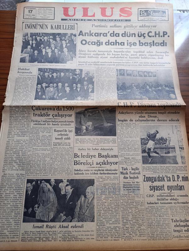 Ulus Gazetesi - 17 Nisan 1950 - Hüseyin Cahit Yalçın - İsmet İnönü'nün Kabulleri - Ankara'da Dün Üç Cumhuriyet Halk Partisi Ocağı Daha İşe Başladı - Çukurova'da 1500 Traktör Çalışıyor - Milli Eğitim Kupası - Türk İngiliz Müzik Festivali - Maliye Bakanı İsmail Rüştü Aksal Evlendi - Kayseri'de İşçi Evlerinin Temeli Atıldı - Zonguldak'ta Demokrat Parti'nin Siyaset Oyunları - Uçan Gölgeler Yazan Server Bedi Yazı Dizisi - Fen Adamı Burhan Arif Ongun'un Kıymetli Bir İcadı - Uluğ İğdemir - İrtica Aklını Başına Alsın - Turizm Davası Ön Plana Alındı - Darüşşafaka'nın 77. Yılı - Tiyatro Atina'da 2 Hafta Yazan Lütfi Ay - Haftanın Filmleri - Yankee Paşa Yazan Edison Marshall Yazı Dizisi - Lüküs Hayat Sus Sinemasında - Müzeyyen Senar Işıl - Yaban Gülü Filmi Ulus Sinemasında - Galatasaray Vefa Fenerbahçe Beşiktaş Berabere Kaldı - İzmir At Yarışları - Maçlar Radyo İle Yayınlanmayacak - Bisiklet Yarışları, Kasım Gülek tarafından kaleme alınmıştır. Ulus Gazetesi - 17 Nisan 1950 - Hüseyin Cahit Yalçın - İsmet İnönü'nün Kabulleri - Ankara'da Dün Üç Cumhuriyet Halk Partisi Ocağı Daha İşe Başladı - Çukurova'da 1500 Traktör Çalışıyor - Milli Eğitim Kupası - Türk İngiliz Müzik Festivali - Maliye Bakanı İsmail Rüştü Aksal Evlendi - Kayseri'de İşçi Evlerinin Temeli Atıldı - Zonguldak'ta Demokrat Parti'nin Siyaset Oyunları - Uçan Gölgeler Yazan Server Bedi Yazı Dizisi - Fen Adamı Burhan Arif Ongun'un Kıymetli Bir İcadı - Uluğ İğdemir - İrtica Aklını Başına Alsın - Turizm Davası Ön Plana Alındı - Darüşşafaka'nın 77. Yılı - Tiyatro Atina'da 2 Hafta Yazan Lütfi Ay - Haftanın Filmleri - Yankee Paşa Yazan Edison Marshall Yazı Dizisi - Lüküs Hayat Sus Sinemasında - Müzeyyen Senar Işıl - Yaban Gülü Filmi Ulus Sinemasında - Galatasaray Vefa Fenerbahçe Beşiktaş Berabere Kaldı - İzmir At Yarışları - Maçlar Radyo İle Yayınlanmayacak - Bisiklet Yarışları adlı eser Türkçe dilindedir.