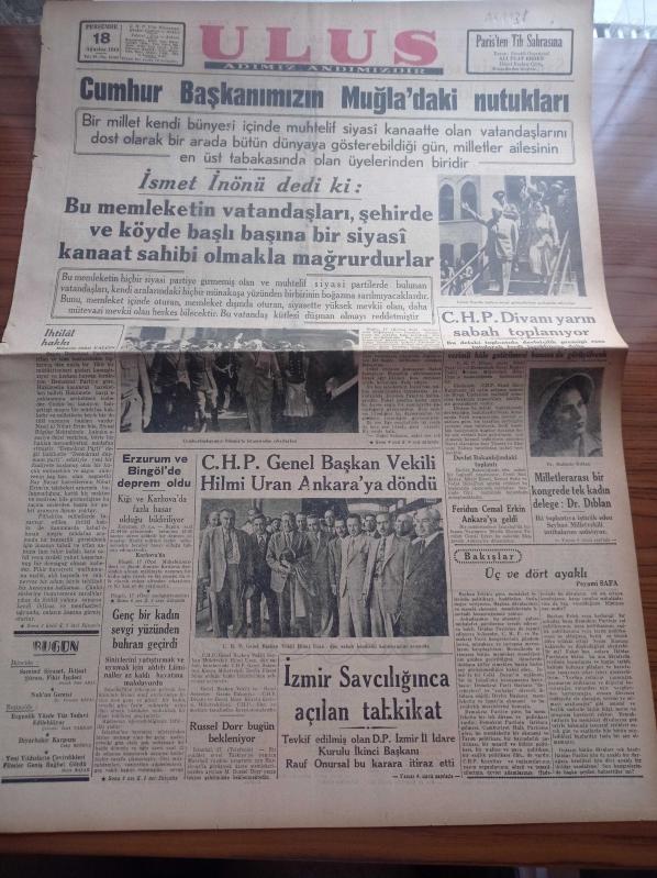 Ulus Gazetesi - 18 Ağustos 1949 - Cumhurbaşkanı İsmet İnönü'nün Muğla'daki Nutukları - Erzurum Ve Bingöl'de Deprem Oldu - CHP Genel Başkan Vekili Hilmi Uran Ankara'ya Döndü - Hüseyin Cahit Yalçın - Peyami Safa Köşe Yazısı - Milletlerarası Bir Kongrede Tek Kadın Delege Doktor Makbule Dıblan - Namık Zeki Aral - Erkekler İşte Böyledir Yazan Maysie Greig Yazı Dizisi - Feridun Osman Menteşeoğlu - Stalin Batılı Şahsiyetlerle Görüşmeye Hazır - Sabahattin Ali'nin Katli Davasına Bugün Bakılıyor - Batı Akdeniz Seferine Trabzon Vapuru Gidecek - Hollywood'un Gözbebeği Haline Gelen Barbara Lawrence - Futbol Karma Takımı Dün Geldi - Üvey Surat Yazan Marcel Ayme Yazı Dizisi - Diyarbakır Karpuzu - Kıymetli Ses Sanatkarı Nihal Tuna Cebeci Doğan Bahçesinde - Usta Boyacı Harris Kullanır - Renan Fosforoğlu Şahin Tek Skeç Revüsü İnci Aile Bahçesinde - Basın Gecesi Bomonti Bahçesinde adlı eser, Kitap > Süreli Yayınlar > Gazeteler > Türkiye > Genel > Günlük kategorisinde İkinci El olarak satıştadır.