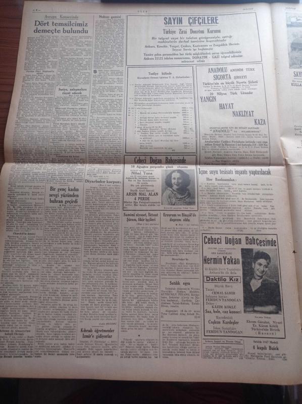 Ulus Gazetesi - 18 Ağustos 1949 - Cumhurbaşkanı İsmet İnönü'nün Muğla'daki Nutukları - Erzurum Ve Bingöl'de Deprem Oldu - CHP Genel Başkan Vekili Hilmi Uran Ankara'ya Döndü - Hüseyin Cahit Yalçın - Peyami Safa Köşe Yazısı - Milletlerarası Bir Kongrede Tek Kadın Delege Doktor Makbule Dıblan - Namık Zeki Aral - Erkekler İşte Böyledir Yazan Maysie Greig Yazı Dizisi - Feridun Osman Menteşeoğlu - Stalin Batılı Şahsiyetlerle Görüşmeye Hazır - Sabahattin Ali'nin Katli Davasına Bugün Bakılıyor - Batı Akdeniz Seferine Trabzon Vapuru Gidecek - Hollywood'un Gözbebeği Haline Gelen Barbara Lawrence - Futbol Karma Takımı Dün Geldi - Üvey Surat Yazan Marcel Ayme Yazı Dizisi - Diyarbakır Karpuzu - Kıymetli Ses Sanatkarı Nihal Tuna Cebeci Doğan Bahçesinde - Usta Boyacı Harris Kullanır - Renan Fosforoğlu Şahin Tek Skeç Revüsü İnci Aile Bahçesinde - Basın Gecesi Bomonti Bahçesinde, Kasım Gülek tarafından kaleme alınmıştır. Ulus Gazetesi - 18 Ağustos 1949 - Cumhurbaşkanı İsmet İnönü'nün Muğla'daki Nutukları - Erzurum Ve Bingöl'de Deprem Oldu - CHP Genel Başkan Vekili Hilmi Uran Ankara'ya Döndü - Hüseyin Cahit Yalçın - Peyami Safa Köşe Yazısı - Milletlerarası Bir Kongrede Tek Kadın Delege Doktor Makbule Dıblan - Namık Zeki Aral - Erkekler İşte Böyledir Yazan Maysie Greig Yazı Dizisi - Feridun Osman Menteşeoğlu - Stalin Batılı Şahsiyetlerle Görüşmeye Hazır - Sabahattin Ali'nin Katli Davasına Bugün Bakılıyor - Batı Akdeniz Seferine Trabzon Vapuru Gidecek - Hollywood'un Gözbebeği Haline Gelen Barbara Lawrence - Futbol Karma Takımı Dün Geldi - Üvey Surat Yazan Marcel Ayme Yazı Dizisi - Diyarbakır Karpuzu - Kıymetli Ses Sanatkarı Nihal Tuna Cebeci Doğan Bahçesinde - Usta Boyacı Harris Kullanır - Renan Fosforoğlu Şahin Tek Skeç Revüsü İnci Aile Bahçesinde - Basın Gecesi Bomonti Bahçesinde adlı eser Türkçe dilindedir.