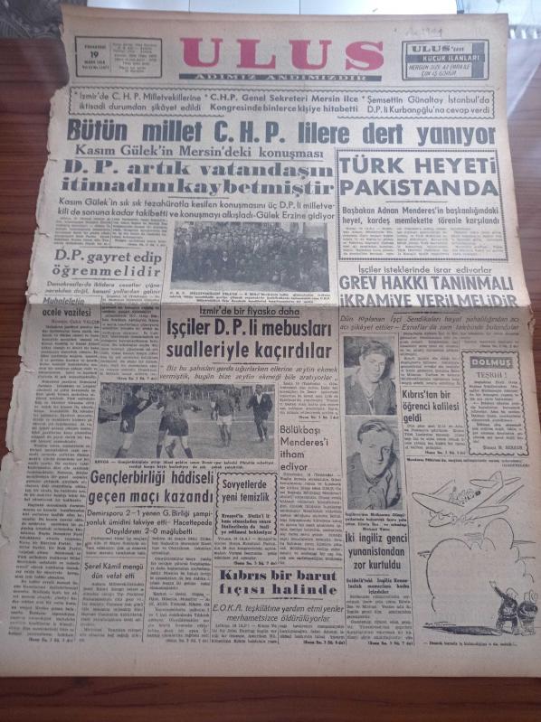 Ulus Gazetesi - 19 Mart 1956 - Bütün Millet Cumhuriyet Halk Parti'lilere Dert Yanıyor - Hüseyin Cahit Yalçın - Başbakan Adnan Menderes'in Başkanlığında Türk Heyeti Pakistan'da - İşçi Sendikaları Grev Hakkı Tanınmalı İkramiye Verilmelidir - İşçiler Demokrat Partili Mebusları Sualleriyle Kaçırdılar - Osman Bölükbaşı Adnan Menderes'i İtham Ediyor - Gençlerbirliği Hadiseli Geçen Maçı Kazandı - Ankara Milletvekillerinden Şeref Kamil Mengü Dün Vefat Etti - Kıbrıs Bir Barut Fıçısı Halinde - Din Konusu Ve Atatürk - Yedi Kızlar Yazan Georges Simenon Yazı Dizisi - Çanakkale Zaferi Anıldı - Orta Doğu İhtilafı İçin Güvenlik Konseyinin Toplanması Muhtemel - Fransa İle Tunus Anlaştı - Kruşçef'in Stalin'i İtham Etmesinden Sonra Stalincilerinde Tasfiye Edilmesi Bekleniyor - Piyale Makarnası - Muhabank - Sana Nebati Margarin - Ölüm Deresi Filmi Ulus Sinemasında - Fikret Hakan - Nevin Alpay - Cebeci Sineması, Kasım Gülek tarafından kaleme alınmıştır. Ulus Gazetesi - 19 Mart 1956 - Bütün Millet Cumhuriyet Halk Parti'lilere Dert Yanıyor - Hüseyin Cahit Yalçın - Başbakan Adnan Menderes'in Başkanlığında Türk Heyeti Pakistan'da - İşçi Sendikaları Grev Hakkı Tanınmalı İkramiye Verilmelidir - İşçiler Demokrat Partili Mebusları Sualleriyle Kaçırdılar - Osman Bölükbaşı Adnan Menderes'i İtham Ediyor - Gençlerbirliği Hadiseli Geçen Maçı Kazandı - Ankara Milletvekillerinden Şeref Kamil Mengü Dün Vefat Etti - Kıbrıs Bir Barut Fıçısı Halinde - Din Konusu Ve Atatürk - Yedi Kızlar Yazan Georges Simenon Yazı Dizisi - Çanakkale Zaferi Anıldı - Orta Doğu İhtilafı İçin Güvenlik Konseyinin Toplanması Muhtemel - Fransa İle Tunus Anlaştı - Kruşçef'in Stalin'i İtham Etmesinden Sonra Stalincilerinde Tasfiye Edilmesi Bekleniyor - Piyale Makarnası - Muhabank - Sana Nebati Margarin - Ölüm Deresi Filmi Ulus Sinemasında - Fikret Hakan - Nevin Alpay - Cebeci Sineması adlı eser Türkçe dilindedir.